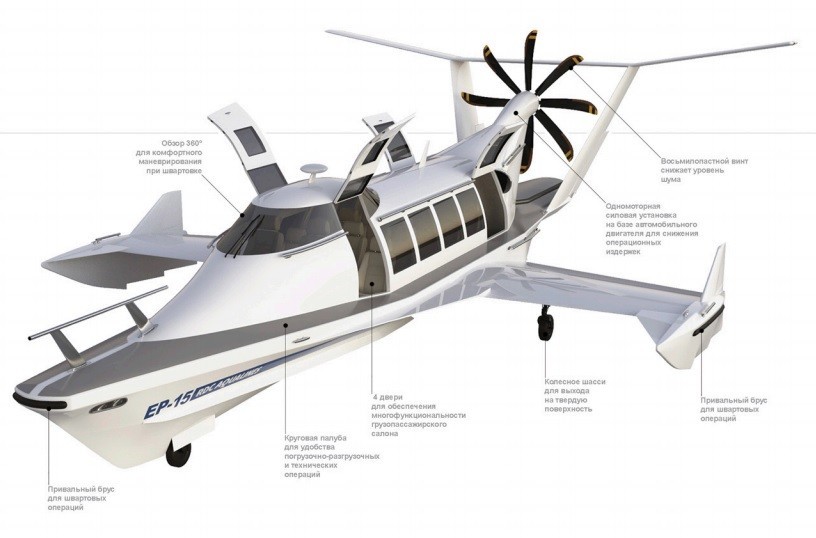 Ставку нижегородские конструкторы делают на 15-местную версию среднемагистрального грузо-пассажирского экраноплана ЭП-15 для работы на дистанциях до 1000 километров. Они будут оснащены двигателями Chevrolet LSX454 мощностью 620 лошадиных сил. Планируемая длина экраноплана — 16,5 метра, ширина — 10 метров, высота — четыре метра. Масса пустого — 2600 килограммов, максимальный взлётный вес — около четырёх тонн.