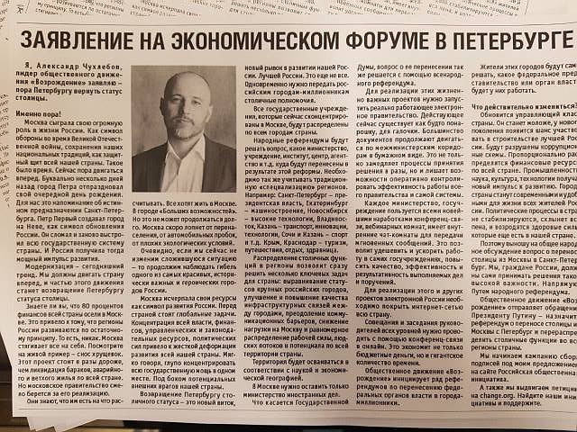 «Петр Первый создавал город на Неве как символ обновления России. Модернизация – сегодняшний тренд. Мы должны двигать страну вперед, и частью этого движения станет возвращение Петербургу статуса столицы», — поясняет общественник свою инициативу на страницах газеты, которая роздана участникам форума.
