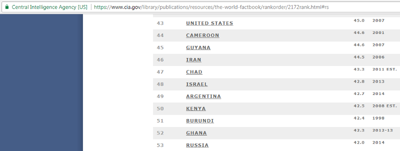 По коэффициенту Джини (GINI), исходя из данных справочника ЦРУ, Россия находится на 53 позиции. На первом месте Лесото и Южная Африка. США располагается на 43 строчке.