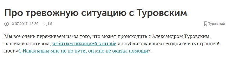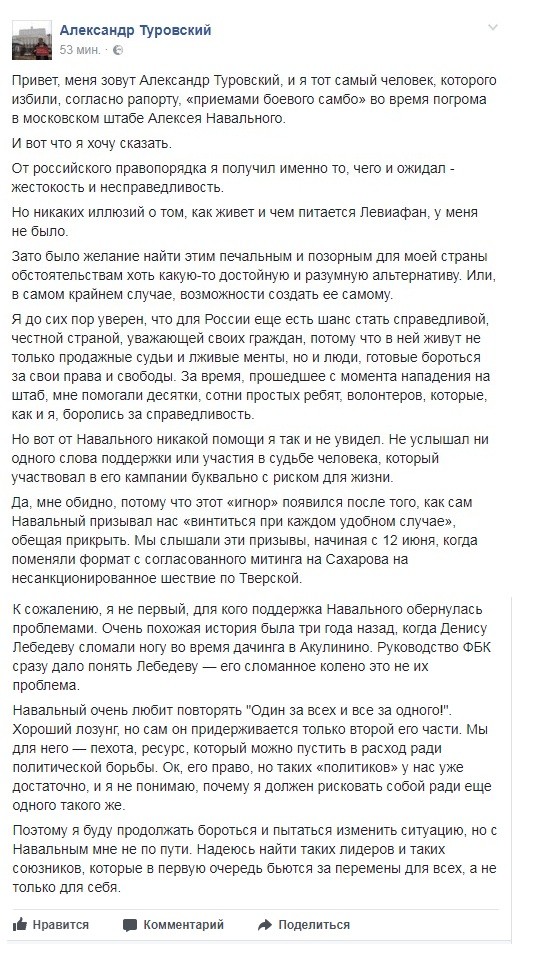 Прошла неделя. Синяки прошли, коленки болеть перестали. Не дождавшись «ни ответа, ни привета» от своего предводителя – Навального – Туровский решил высказать все, что он думает о «борце с коррупцией», который ни во что не ставит своих людей.