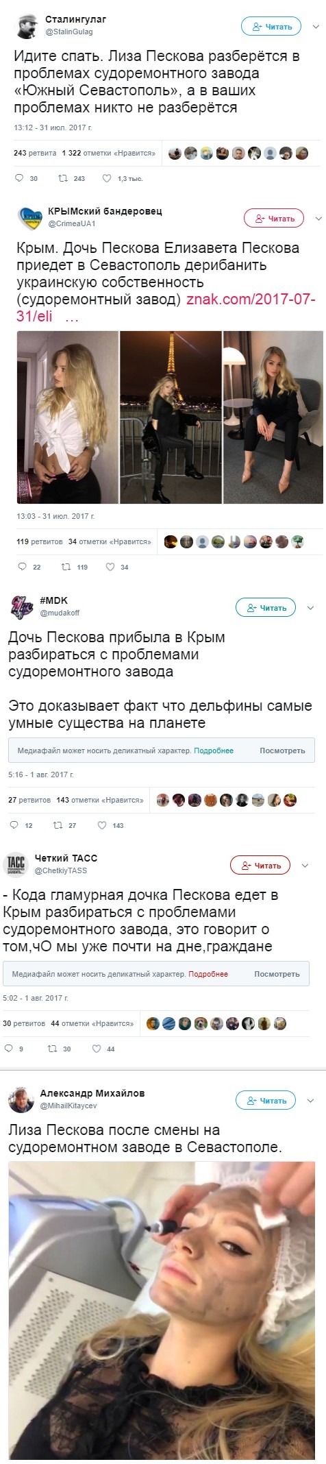 "Крым. Дочь Пескова в Севастополе "решает проблемы судоремонтного завода". ... ждали "хороших российских управленцев". Дождались"