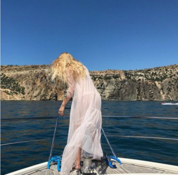В Крыму Елизавета сделала несколько фотографий. На одних из них она позирует в изысканном платье с двумя рабочими. На других - в пикантном платье катается по морю.