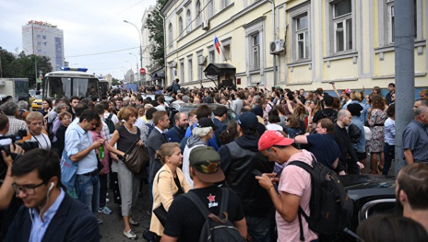 Участники акции в поддержку руководителя театра "Гоголь-центр" Кирилла Серебренникова у здания Басманного суда