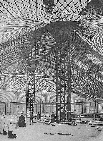 Строительство овального павильона с сетчатым стальным висячим покрытием для Всероссийской выставки 1896 года в Нижнем Новгороде, фотография А. О. Карелина, 1895