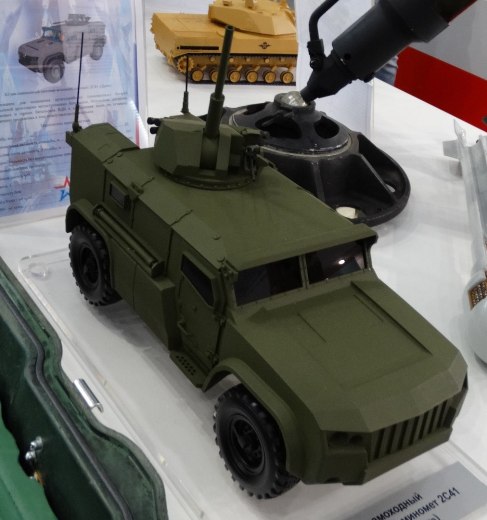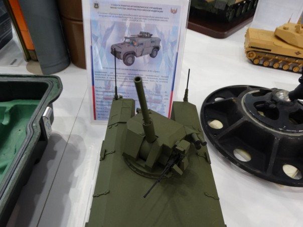 Модель варианта 82-мм самоходного миномета 2С41 "Дрок", создаваемого по ОКР "Набросок" при головной роли АО «Центральный научно-исследовательский институт «Буревестник» (Нижний Новгород; входит в состав АО «Научно-производственная корпорация «Уралвагонзавод»), на стенде на стенде Главного ракетно-артиллерийского управления Министерства обороны Российской Федерации в экспозиции Международного военно-технического форума "Армия-2017" (с) "Вестник Мордовии" / vestnik-rm.ru