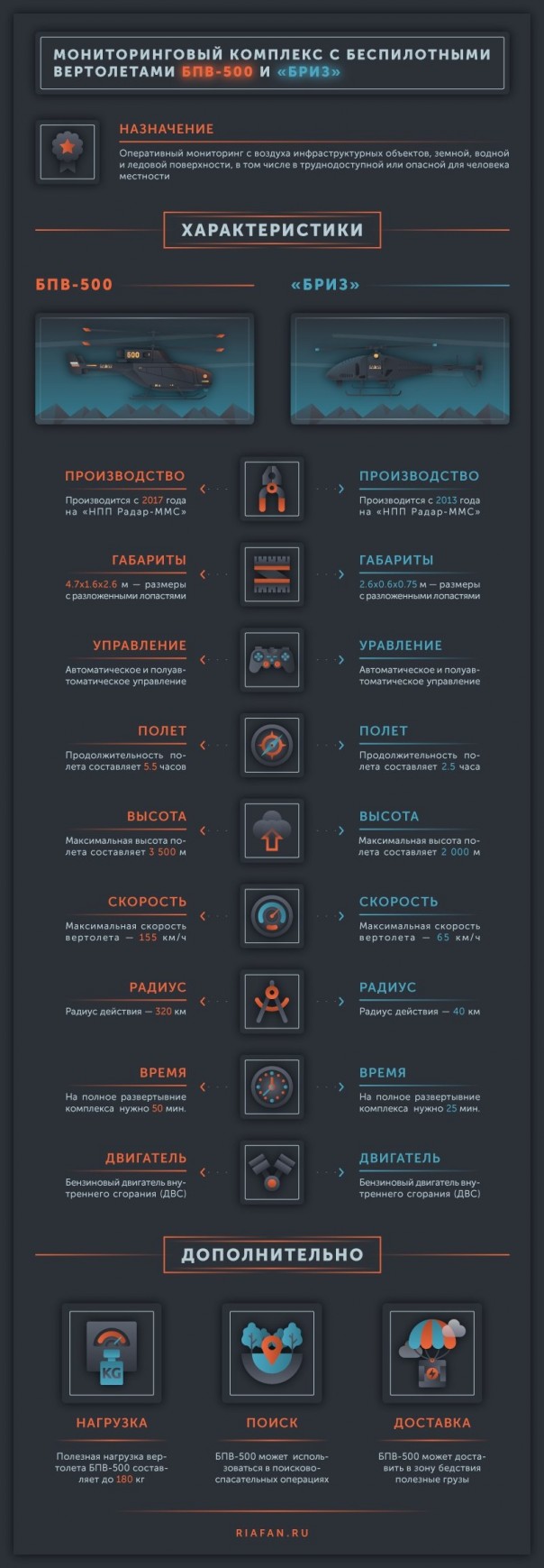 Беспилотные вертолеты БПВ-500 и «Бриз» обеспечивают поисково-спасательные работы, патрульно-охранные и контртеррористические мероприятия. Кроме того, вертолеты способны проводить ледовые разведки; определять масштабы последствий стихийных бедствий и техногенных катастроф; осуществлять контроль за состоянием линии электропередач, трубопроводов и лестных угодий; экологический контроль местности, акваторий и атмосферы.