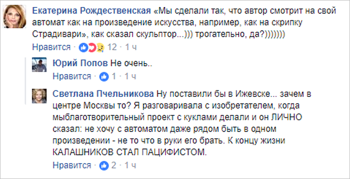 «Мне очень жаль, что в последнее время из оформления нашей столицы искусство уходит начисто. Как специально кто-то делает. Эти чудовищные арки картонные, которые заслоняют архитектуру, это удивительное отсутствие вкуса, и памятник Калашникову сюда вписывается по полной программе. Если человека не научили в детстве отличать красивое от некрасивого, если он не имеет соответствующего образования или он просто был двоечником, то объяснить словами это невозможно», — приводит слова Макаревича РЕН ТВ.