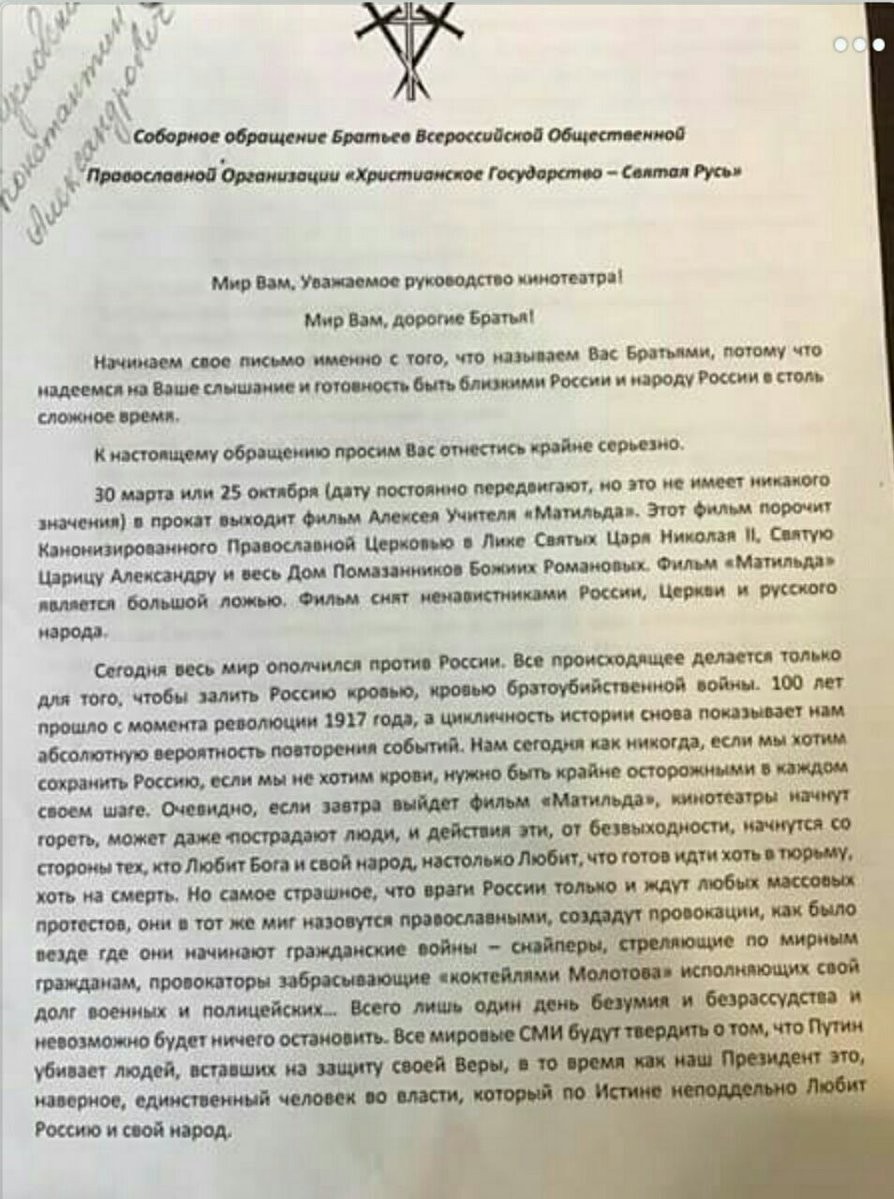 По большому счету это новоявленное явление к религии имеет отношение очень посредственное, и мало кто из недоумков вообще понимает против чего конкретно он протестует. Я уверен, ни одни из них не видел фильм, и не знаком со сценарием. Шумиха, устроенная на теме «Матильды» носит чисто политический характер, завуалированный под религиозный протест. Никогда не думал, что буду цитировать Энтео, но в данном случае полностью с ним согласен.