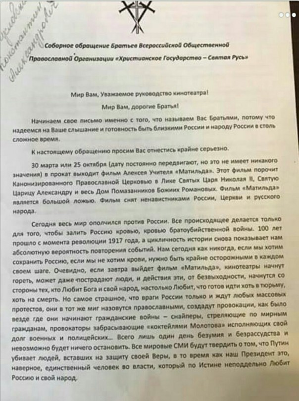 Начались поджоги машин, попытки поджога кинотеатров, ряд кинотеатров был вынужден отказаться от запланированного показа фильмов. Мы столкнулись с новой реальностью, новым видом террора к которому, как оказалось мало кто готов. И это удар прежде всего по православию, как бы неожиданно не звучало на первый взгляд. Очередной раскол в обществе и удар по русской культуре, ведь православие для большинства из нас – это одна из составляющих нашей русской культуры. И любой нормальный человек сейчас, глядя на этот «православный талибан», каковым его уже назвали, будет дистанцироваться.