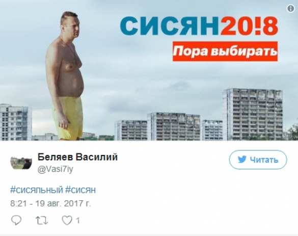 Неизвестные вывесили большой плакат с изображением полуголого оппозиционера Алексея Навального и надписью «Сисян 20!8» рядом с местом проведения митинга политика в Новосибирске.