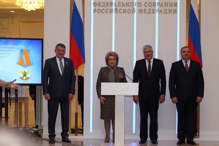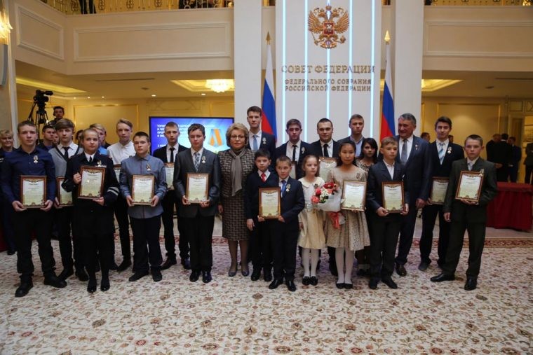 Все награжденные дети, помимо медалей и почетных грамот, получили памятные подарки из рук Героев России, Советского Союза, членов Совета Федерации и других почетных гостей.