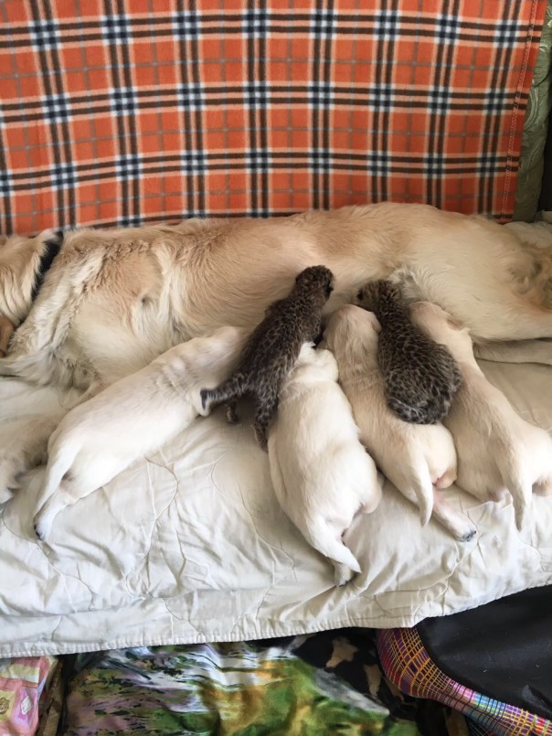 Сотрудники зоопарка пытались кормить малышей, но те очень слабо сосали молоко из бутылочки, поэтому срочно пришлось искать «маму» из мира живой природы. Замысел увенчался успехом: живущая в парке собака — золотистый ретривер по кличке Тесси — недавно родила четырех щенков, и она охотно приняла в свое семейство еще двух детенышей.