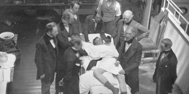 Первая публичная операция под общим наркозом (реконструкция), проведённая Уильямом Мортоном 16 октября 1846 года в Бостоне