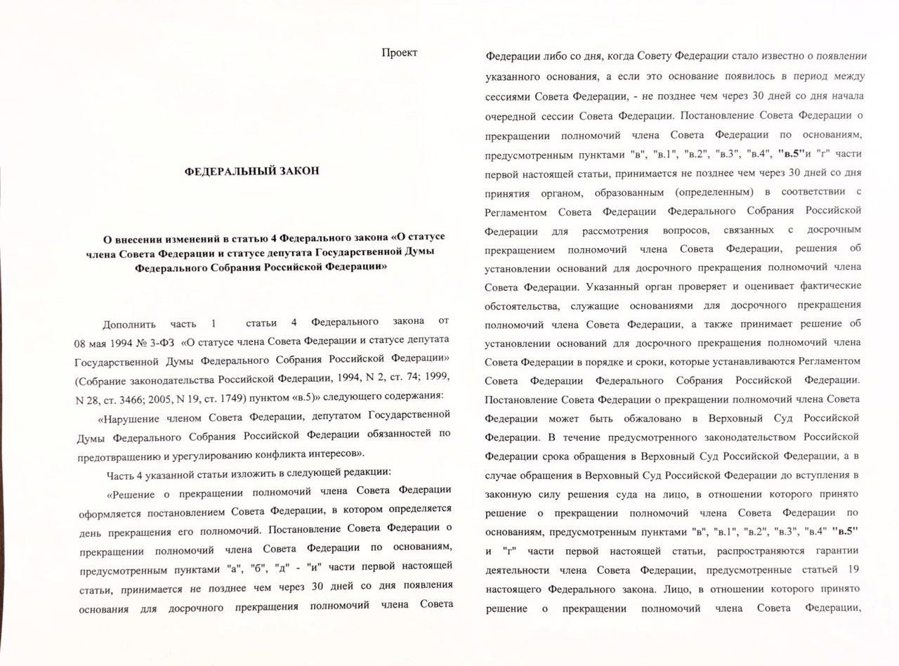 Депутат Госдумы РФ и бывший прокурор Республики Крым Наталья Поклонская, возглавляющая думскую комиссию по контролю за достоверностью сведений о доходах и расходах депутатов, подготовила законопроект о досрочном лишении депутата мандата за нарушение им обязанностей по предотвращению и урегулированию конфликта интересов. Соответствующая инициатива направлена в экспертный совет при профильном комитете Госдумы.