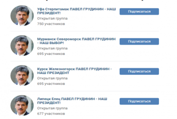 Бесполезная затея, ведь у Грудинина настолько сомнительная репутация, что клеймо ставить негде. Ну, а привлечение ботов вообще за гранью. На одной видимости далеко не уедешь. Кроме того, лишь человек, далекий от интернета, мог не заметить, как в декабре 2017 года в соцсети «ВКонтакте» появилось более тридцати одноименных групп в поддержку миллиардера. Только названия городов менялись, а в остальном различий не было.
