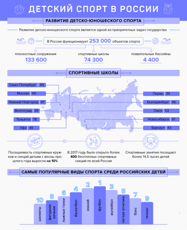 Для популяризации спорта среди детей в России действует ряд государственных программ. За последние три года было открыто 115 новых физкультурно-спортивных учреждений дополнительного образования детей. Общая численность физкультурно-спортивных учреждений дополнительного образования детей достигла 3052. В настоящее время в системе образования насчитывается 1758 - детско-юношеских спортивных школ (ДЮСШ), 451 - специализированная детско-юношеская школа олимпийского резерва (СДЮШОР), 708 - детско-юношеских клубов физической подготовки (ДЮКФП).