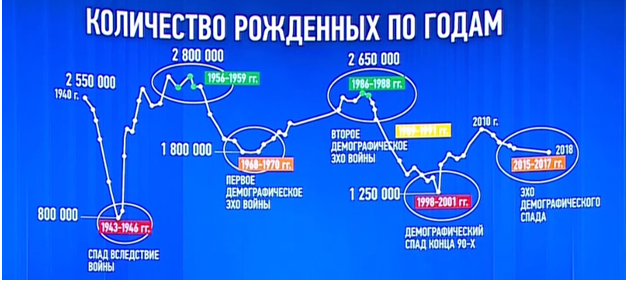 • Благодаря специальным мерам в демографической политике, удалось пройти без существенного снижения провалы, обусловленные потерями в ВОВ;