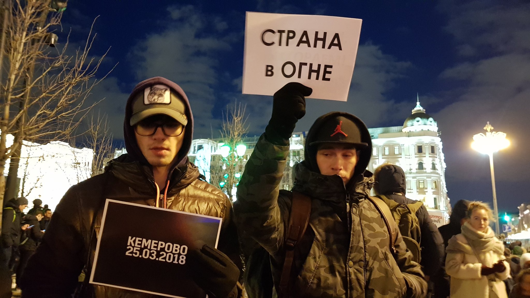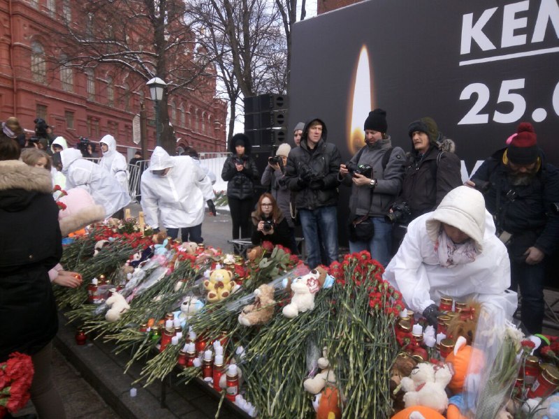 В 17-00 началась акция памяти на Манежной площади, организованная московскими властями. У входа в Александровский сад установлен баннер с надписью "Кемерово. 25.03.2018. Мы с тобой". Фотографии погибших, свечи. Волонтёры раздают мягкие игрушки и красные гвоздики.