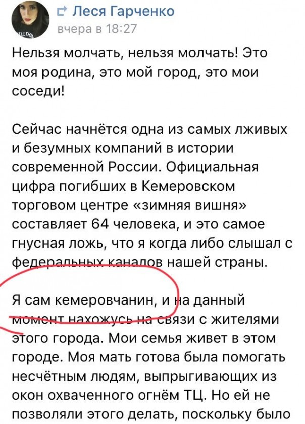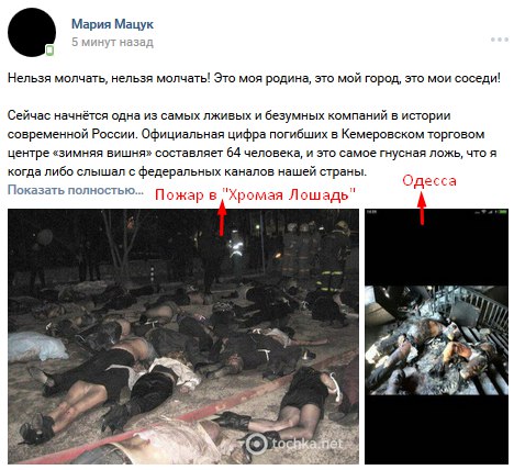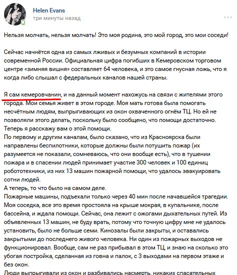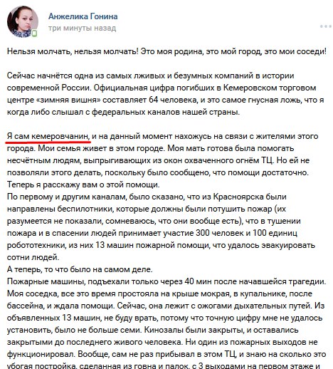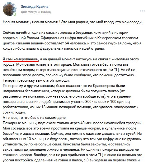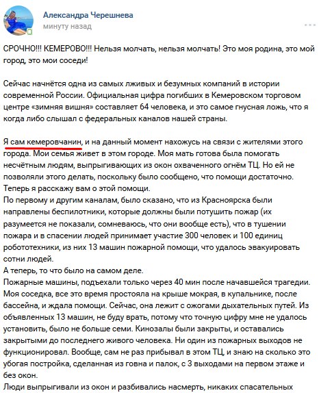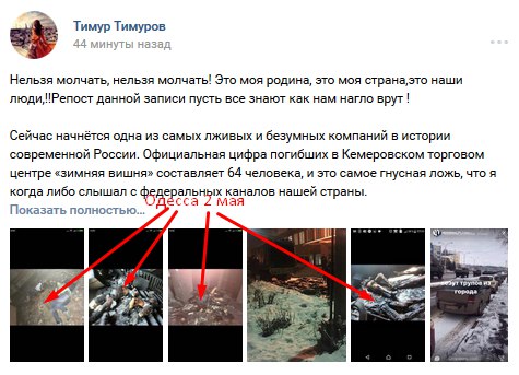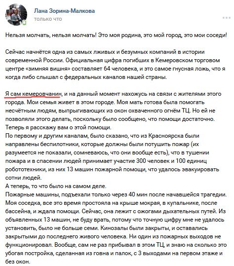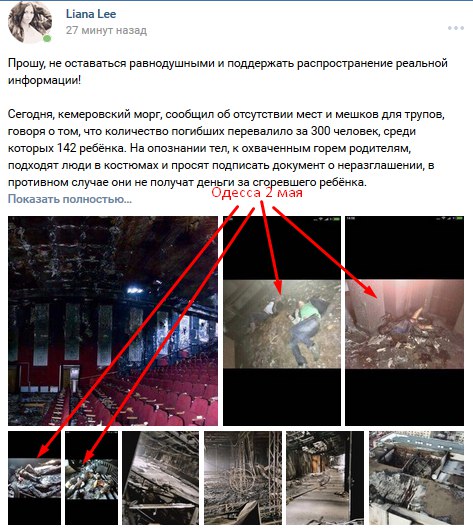Провокаторы целенаправленно раскидывают по соцсетям дезу о "350-400 погибших". Фейковую информацию о "более 300 погибших" распространил, в частности, украинский телефонный пранкер Евгений Вольнов (Никита Кувиков). Подонок звонил в кемеровские морги, представлялся майором МЧС и советовал готовить места для сотен тел. Звонил он и родственникам, одноклассникам погибших, рассказывая о трёх сотнях тел. Представившись сотрудником администрации президента, пытался заставить чиновников "как можно скорее" убрать цветы и игрушки, оставленные скорбящими людьми в память о погибших детях. Всё это действо на своём YouTube-канале он назвал "Угораем с Кемерово". Вольнов глумился, издевался: пожар с многочисленными жертвами для толстого содомита (не имеет даже среднего образования, задерживался за покупку наркотиков, в 2016 году совместно с Алексеем Навальным, Станиславом Белковским и Дмитрием Дёмушкиным записал ролик в поддержку кандидата в депутаты Госдумы РФ от ПАРНАСа Вячеслава Мальцева, поддерживает тёплые отношения с главой навальненского штаба Леонидом Волковым и "Открытой Россией" Михаила Ходорковского, действует под крышей СБУ) - "дикий угар в «Зимней вишне»" и повод для циничного зубоскальства.