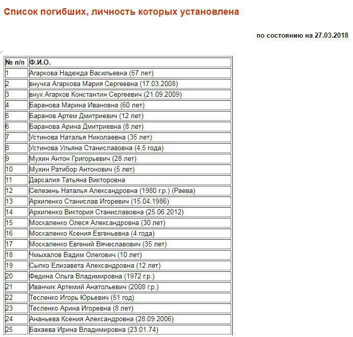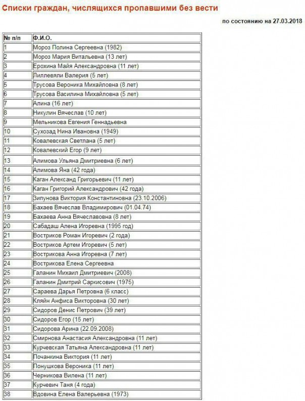 На сайте кемеровской городской администрации опубликован полный список погибших, пропавших без вести, госпитализированных в результате пожара в ТРЦ "Зимняя вишня". В списке пропавших без вести - 38 человек, в том числе 26 детей. Но вскоре после публикации сайт подвергся хакерской атаке и оказался недоступен.
