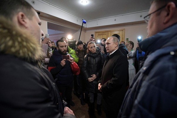 Президент встретился с инициативной группой, обвинившей власти в замалчивании, не доверяющей официальной информации о количестве жертв и требующей отставок. Глава государства дал слово, что расследование причин трагедии (находящееся под его личным контролем) будет максимально прозрачным, виновные обязательно понесут наказание. "Здесь следственная группа работает, 100 человек. Пройдут по всей цепочке, начиная с тех, кто давал разрешение, кончая теми, кто должен отслеживать безопасность, этим ЧОПом, сотрудник которого сидел там и кнопку не нажал вовремя, и так далее. Пройдут по всей цепочке, начиная с момента перерегистрации этого здания и выдачи разрешения из фабрики сделать развлекательный центр, кто давал разрешение на то, чтобы эти материалы использовать при таком целевом назначении. Это возмутительно, без сомнения. Эти 100 человек следователей отработают по полной программе, это точно, даже не сомневайтесь", - пообещал Путин. "Вопрос в чём, в том, что таких объектов по стране много. Вот сейчас МЧС зашевелилось, начали выяснять. Их там сотни", - отметил он. Члены инициативной группы потребовали полную информацию о погибших, поскольку "из-за отсутствия информации соцсети жути нагоняют". Один из активистов спросил президента: "Тулеев будет ещё сидеть у нас до сих пор?". "Произошла страшная трагедия, просто ужасная. Для того, чтобы принять решения подобного рода… Во-первых, под камеры это не делается – для красного словца на фоне трагедии. Первое. А второе: нужно точно совершенно определить, кто в чём виноват. И когда мы это сделаем, а мы это сделаем точно, будут приняты соответствующие решения" - ответил Путин. "Здесь статус ни при чём, когда люди погибли, столько мы детей потеряли. Мы говорим о демографии, призываем детей рожать, а в результате таких вот вещей столько детей потеряли", - добавил он.