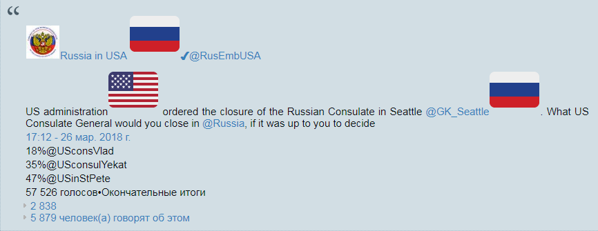 Опрос в соцсети в понедельник устроили дипломаты из российского посольства в Вашингтоне. Они предложили голосовать за закрытие одного из трех генеральных консульств США: во Владивостоке, в Екатеринбурге и в Санкт-Петербурге.