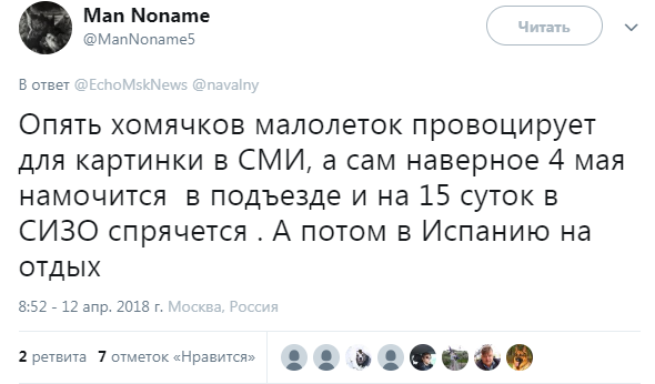 Для российского общества он давно превратился в политический труп. Яркое тому подтверждение — вялая реакция зрелой общественности на инициативу Навального устроить беспорядки 5 мая. По сути, оппозиционеру остается надеяться лишь на неокрепших психикой молодых людей, готовых бузотёрить по любому поводу.