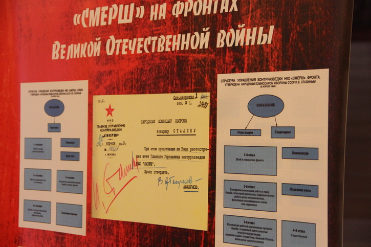Рассекреченные документы управления контрразведки «Смерш» («Смерть шпионам») впервые представлены на выставке в театре имени Лавренева в Севастополе. Как рассказал официальный представитель управления ФСБ по Республике Крым и Севастополю Сергей Терехов, 186 документов были рассекречены только в 2018 году специально для этой выставки.
