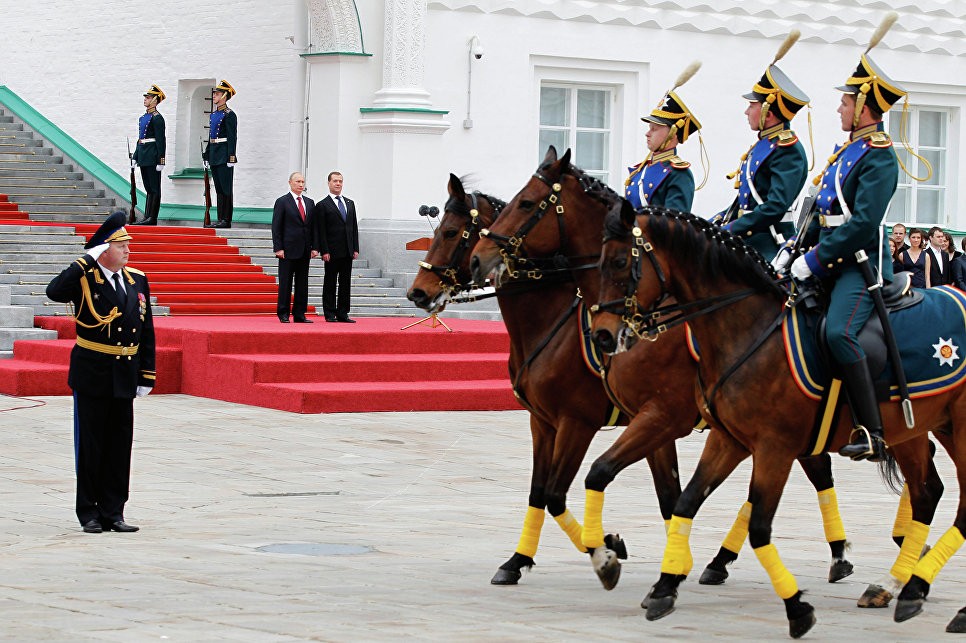 Вступивший в должность президент проходит через Георгиевский и Александровский залы и выходит на Соборную площадь, где принимает парад президентского полка.