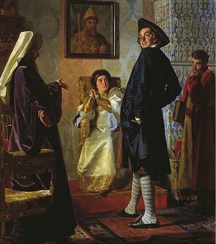 Юный Пётр вырядился в немецкое платье, чем шокирует патриарха Андриана и мать, царицу Наталью. Тягу ко всему иностранному царь сохранил до конца своей жизни.