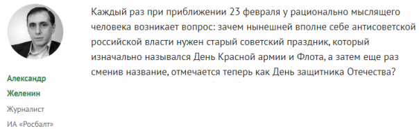 Так, журналист ИА Александр Желенин высказался относительно Дня защитника Отечества: