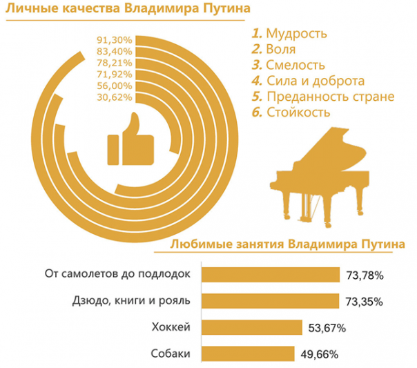 Итак, «мудрым» его назвали 91,3% респондентом, волевым – чуть более 83%, а смелым – почти 79%. Конечно, у Владимира Путина еще очень много положительных черт, например, умение слушать и выполнение своих обещаний, и это не говоря об обаятельности. Да, России повезло с президентом, и неудивительно, что на последних выборах он получит столь высокий процент доверия.