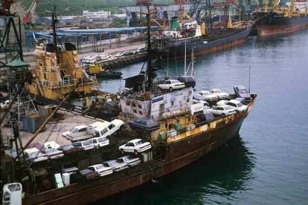 Дальний Восток. Машины разгружают. Подержанный автохлам, который давал фору нашему новому автопрому.