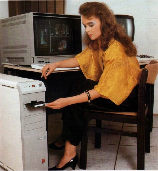 Компьютеры. Да, в 90-е они пришли и к нам. Но мне тут девушка нравится. Сейчас такое даже на периферии не встретишь.