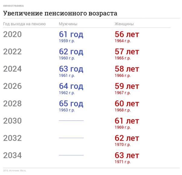 Сейчас женщины в России выходят на пенсию в 55 лет, мужчины — в 60. В 2020 году женщины смогут выйти на пенсию в 56 лет, мужчины — в 61 год. Таким образом, первыми, кого коснётся реформа, станут женщины 1964 года рождения и мужчины 1959 года рождения.