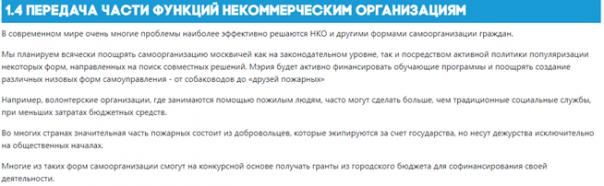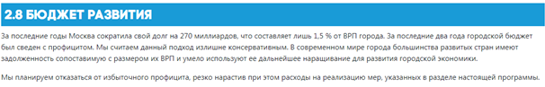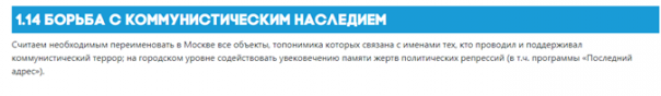Удивляет и пункт программы про борьбу с коммунистическим наследием. Причем от данного предложения так и несет борьбой на Украине с коммунистическим прошлым. Но зачем это Москве? Разве что растрачивать бюджет на таблички с новыми названиями улиц.