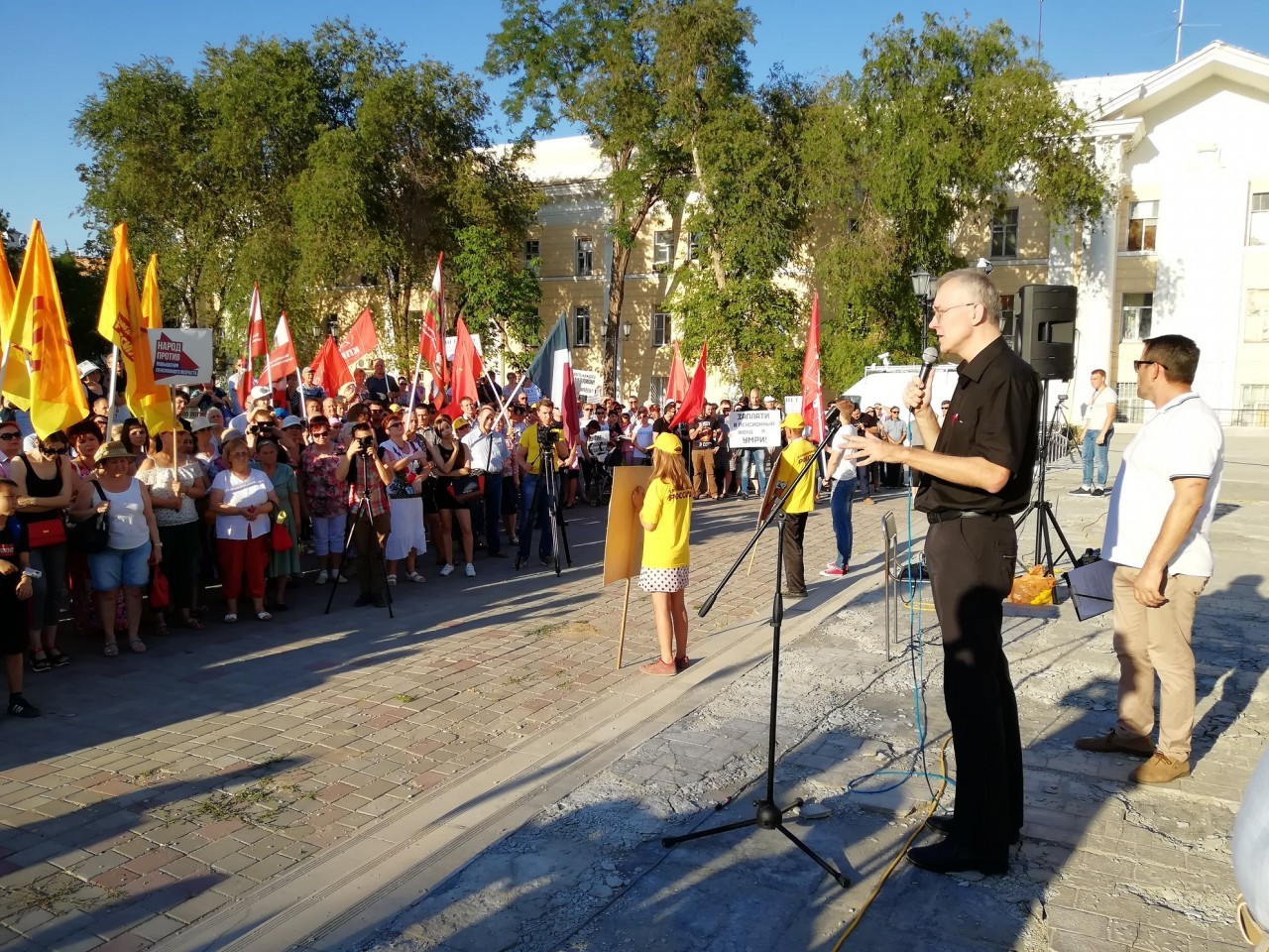 Открыл митинг депутат Государственной Думы РФ Олег Шеин, являющийся одним координаторов общенациональной протестной кампании. Парламентарий обратил внимание собравшихся, что в случае принятия законопроекта на рынок труда будут дополнительно выброшены миллионы работников, что повлечет снижение заработной платы. Помимо этого, на 5-8 лет заморозятся социальные и профессиональные лифты. «Это законопроект о нищете в стране. Причем никаких демографических и финансовых предпосылок к принятию такого документа нет. Дефицит Пенсионного фонда вызван в первую очередь большим количеством нелегально работающих граждан. Только в Астраханской области их 380 тысяч человек. Это не вина людей, а их беда. За счет повышения пенсионного возраста правительство собирается выиграть 250 млрд. рублей. Мы предлагаем ввести плоскую шкалу отчислений в пенсионный фонд, то есть, чтобы люди, получающие зарплату больше 100 тысяч рублей, платил в Пенсионный фонд такой же процент, как и все остальные. Это даст дополнительный доход в 600 млрд. рублей», — сказал депутат.