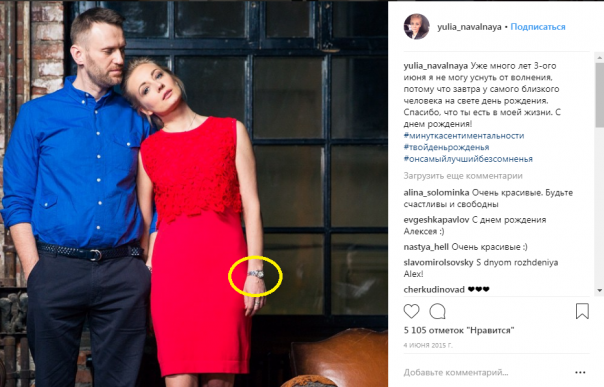 Впрочем, это не единственные дорогие часы, которые есть у безработной жены Навального. Как оказалось, Юлия располагает солидным выбором дорогих аксессуаров, по всей видимости, подаренных мужем. Вот фото от декабря 2016-го года: