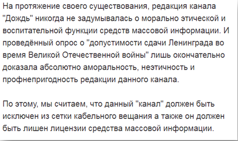 Те, кто ее подписали, рассказали о своем возмущении деятельностью канала, работники которого только и делают, что, пардон, гадят в информационном пространстве. Они разжигают ненависть по отношению к различным социальным группам. Например, неуважительно высказываются о ветеранах ВОВ, блокадниках, военнослужащих, полицейских, людях рабочих профессий.