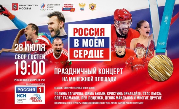 Сегодня в 19:00 на Манежной площади пройдет концерт, посвященный нашим спортивным победам. Он называется «Россия в моем сердце» и полностью отражает настрой россиян.