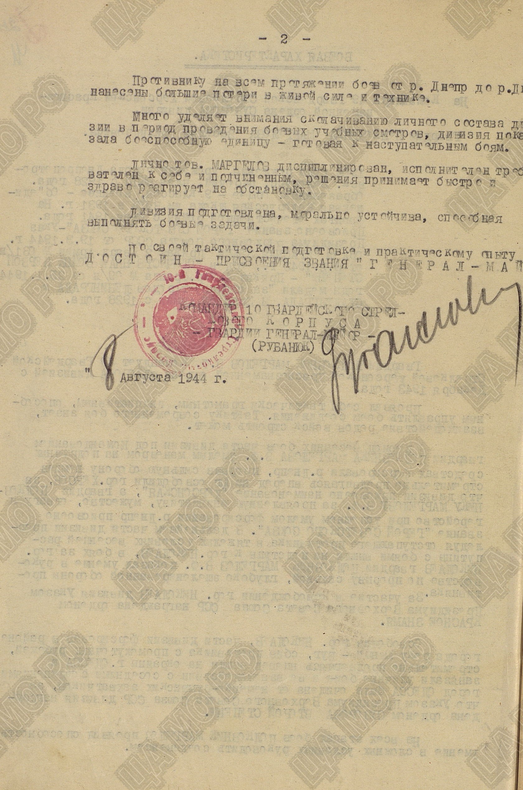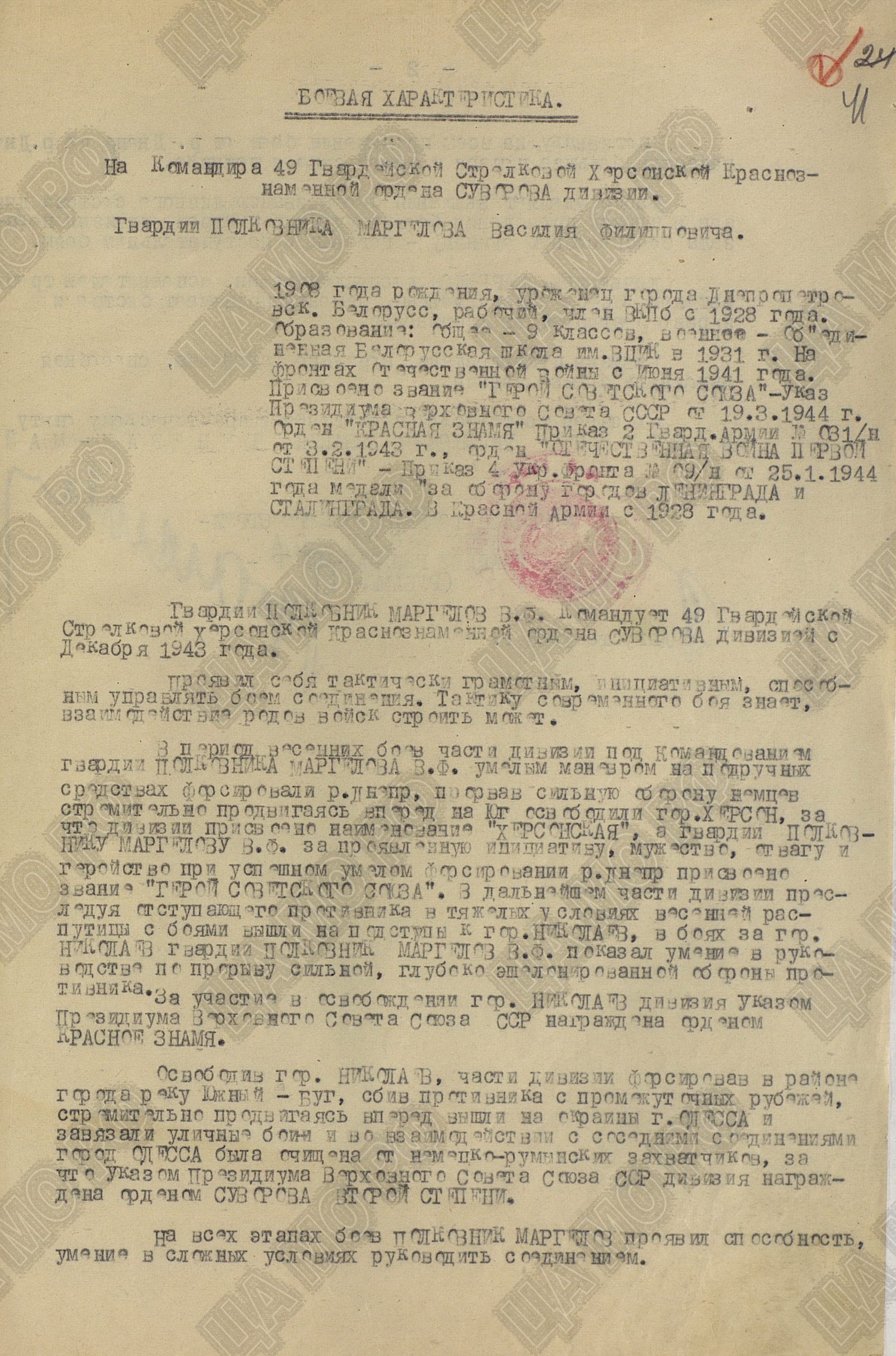 Боевая характеристика на командира 49 гвардейской стрелковой Херсонской Краснознаменной ордена Суворова дивизии гвардии полковника Василия Филипповича Маргелова