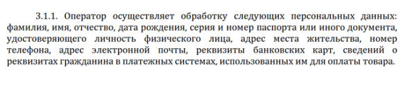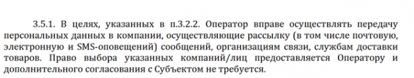 Интересно, что в документации магазина указано, что оператор может передавать персональные данные в компании по рассылке смс и прочего, и это не запрещено. При этом спрашивать разрешения у носителя данных никто не обязан.