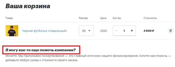 На сайте есть опция – пожертвование в ФБК в процентах от суммы этой самой покупки. То есть если человек, например, покупает у Навы футболку за 1000 рублей, он может пожертвовать дополнительно, скажем, 20%, и общая сумма к оплате товара ему составит 1200 рублей. Вот только на поддержку фонда пойдет только 200 р.