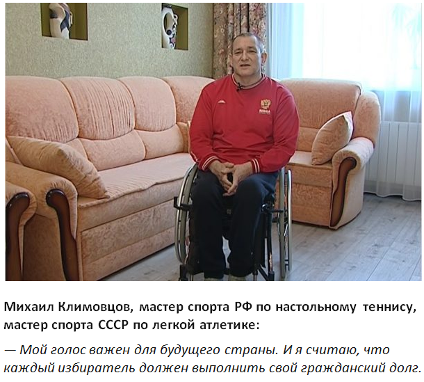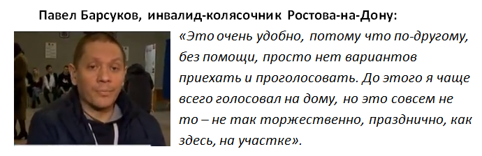Таким образом, даже при ограниченных возможностях самостоятельно передвигаться, инвалиды и другие маломобильные группы населения РФ находят возможности, чтобы сделать свой выбор вместе со своими земляками. Ведь именно так они делают свой вклад в жизнь своей области, страны.