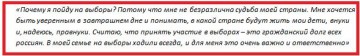 Собственно, и какая цена за всё это? Необходимо потратить каких-то 15-20 минут на поход на избирательный участок, который находится в собственном же дворе. Это ничтожно малая стоимость за то, чтобы у собственного государства было воистину светлое будущее.