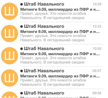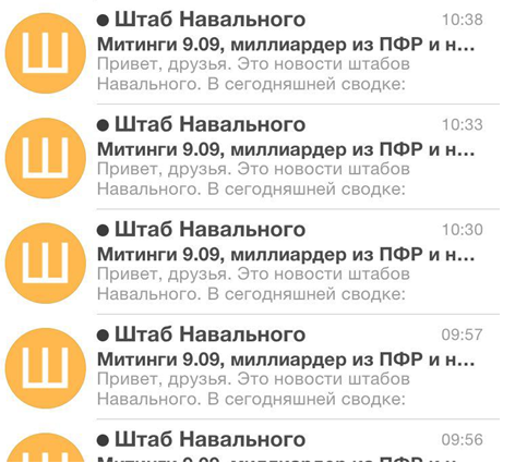 И, наконец, последним отчаянным шагом навальнистов является агрессивная пиар-кампания. Так, на почту подписанных на Штаб Навального начали постоянно приходить ссылки, которые более походят на спам-рассылку, ведь промежуток между ними составлял не более 10 минут.