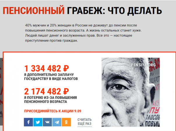 Навальнисты создали сайт под названием pensiya.org, на котором есть так называемый калькулятор, призванный для высчитывания суммы денег, которую россиянин якобы не дополучит от государства, и сколько он переплатит налогов. Для того чтобы узнать эту цифру, вам всего лишь надо ввести элементарные данные: год рождения, зарплату, пол, город проживания и все! Вы увидите какие-то невнятные данные, при получении которых не учитывалась масса необходимых макроэкономических факторов, например, инфляция, изменения в заработной плате и многое другое. Поэтому доверять таким цифрам определенно не стоит. Но Навальный не думает о нюансах, ему просто надо запустить «горячий» проект, чтобы народ поверил ему.