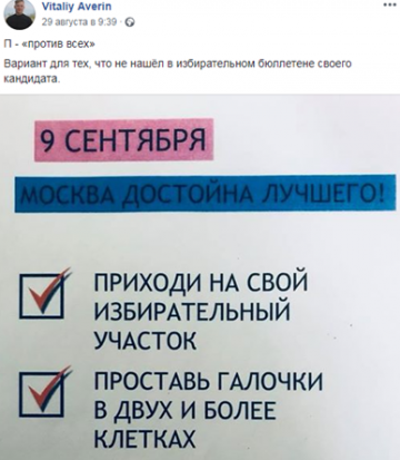Начнем с того, что координатор региональных отделений «Голоса» Виталий Аверин призвал у себя в Фейсбуке портить бюллетени на выборах 9 сентября. Как? Скажите, как координатор независимой организации якобы позволяет себе призывы подобного рода?