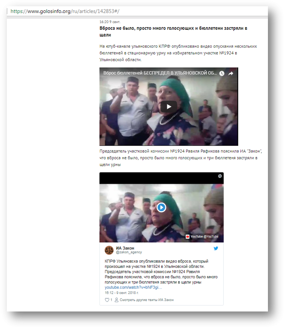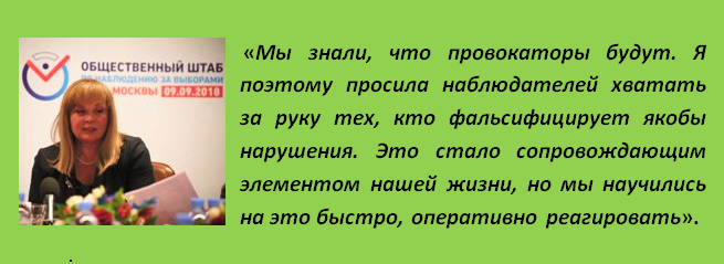 Впрочем, к такому повороту событий в ЦИКе оказались готовы. Председатель Центризбиркома Элла Памфилова специально попросила своих коллег в регионах отслеживать возможные инсинуации и оперативно на них реагировать. Таким образом, провокации активистам «Голоса» не удались, поскольку по каждому вбросу было дано опровержение.