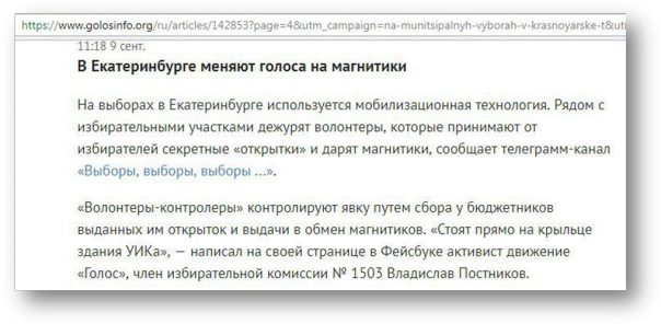 И подобных измышлений ниАчём, оформленных как заявления о нарушениях, у «Голоса» оказались десятки. Впрочем, активисты движения не менее борзо переводили стрелки на другие движения и партии, обнаружив подделку. Например, они радостно припечатали КПРФ, когда оттуда сообщили о вбросе. На деле, вещает «Голос», в щели урны для голосования просто застряли 3 бюллетеня.